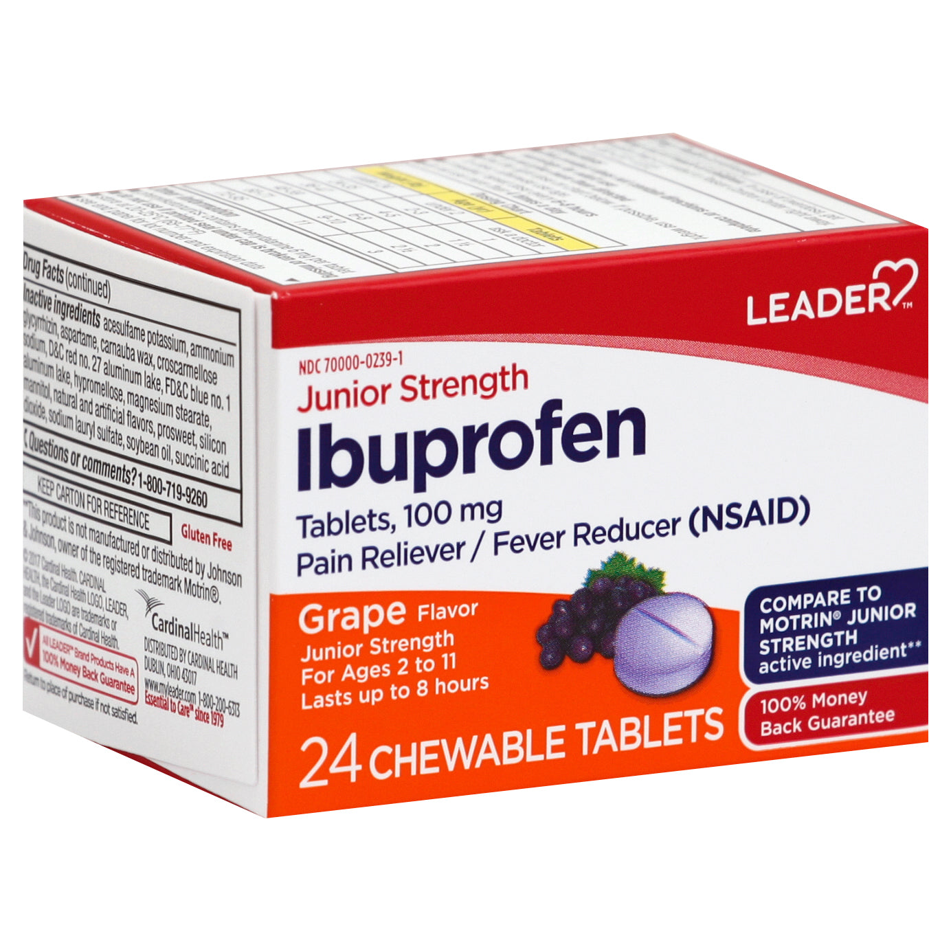 Leader Junior Ibuprofen Chewable Tablets in grape tasty flavor offer effective pain relief for children. With 24 chewable tablets per pack, it provides convenient dosing for minor aches, pains, and fevers. These tablets are gentle on the stomach and quickly alleviate discomfort. Keep them on hand for fast relief from common childhood ailments, ensuring your child stays comfortable and active