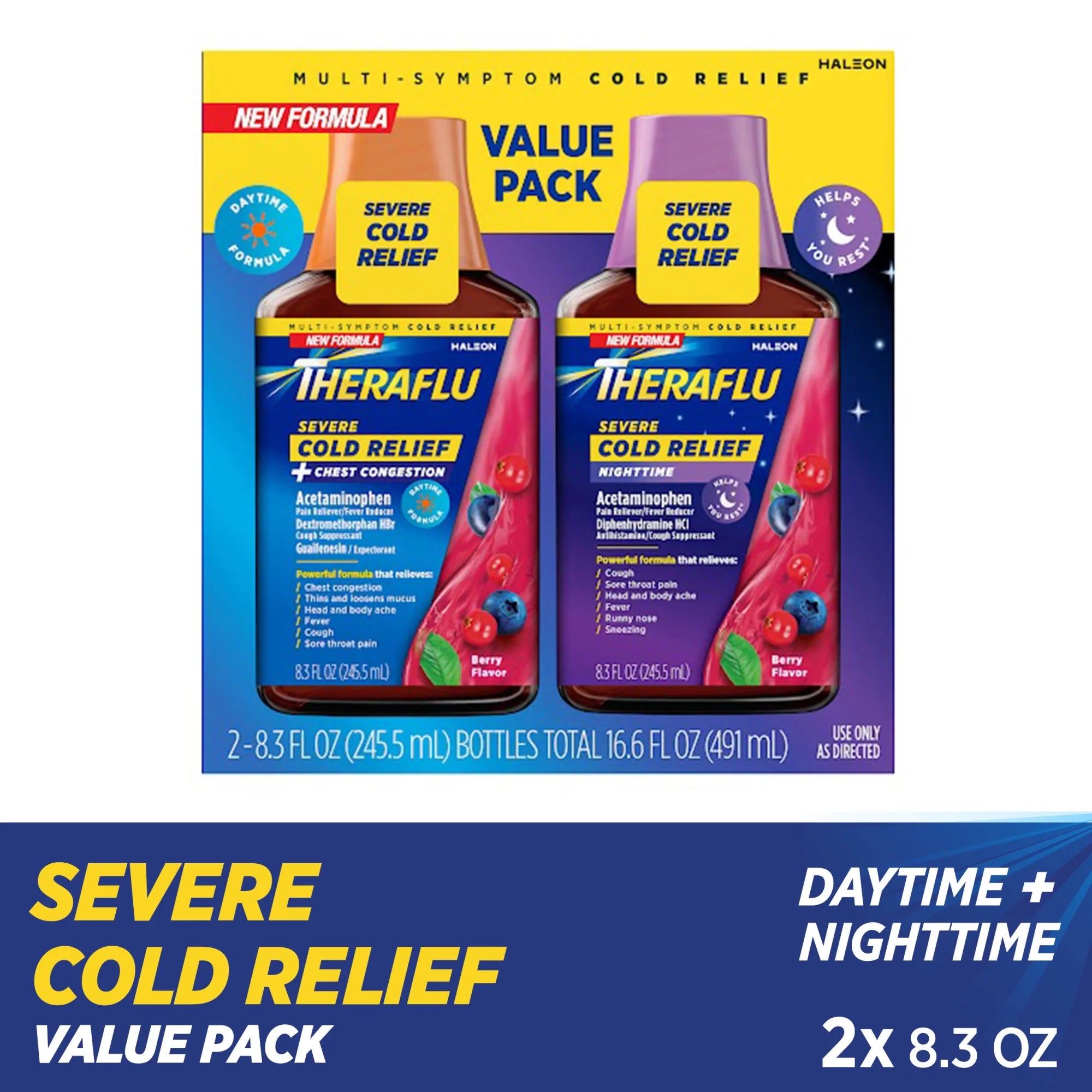 Theraflu Severe Cough Cold and Flu Day and Nighttime Relief Medicine Syrup, Berry, 8.3 Fl Oz, 2 Pack