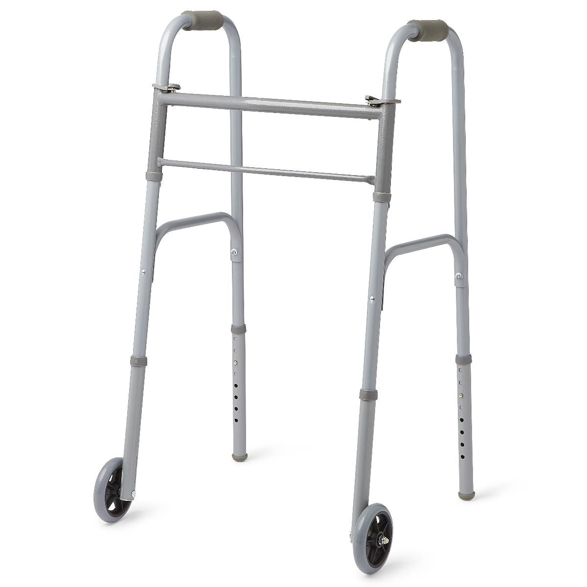 Medline Two-Button Folding Walker with Wheels, 5-Inch