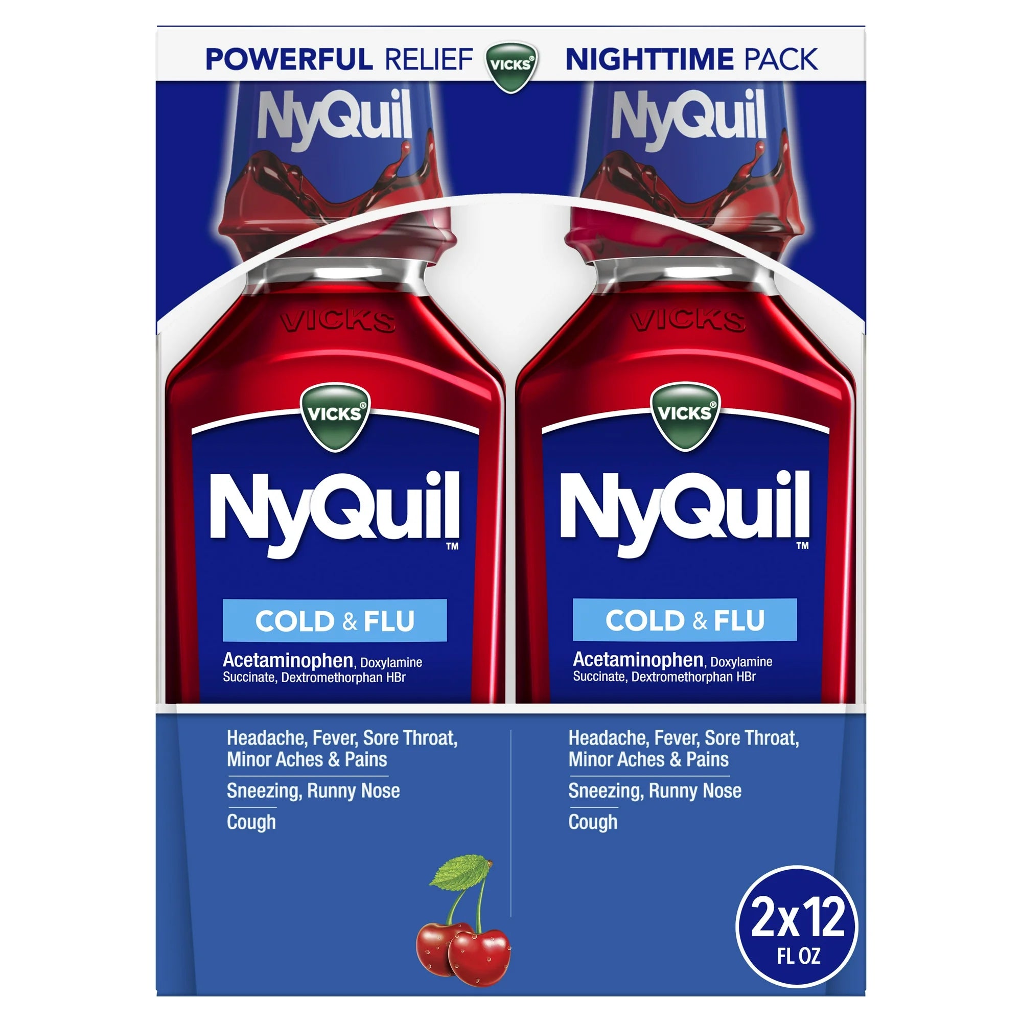 Vicks NyQuil Nighttime Cold, Cough & Flu Liquid Medicine, Over-the-Counter Medicine, Cherry, 2x12 Oz